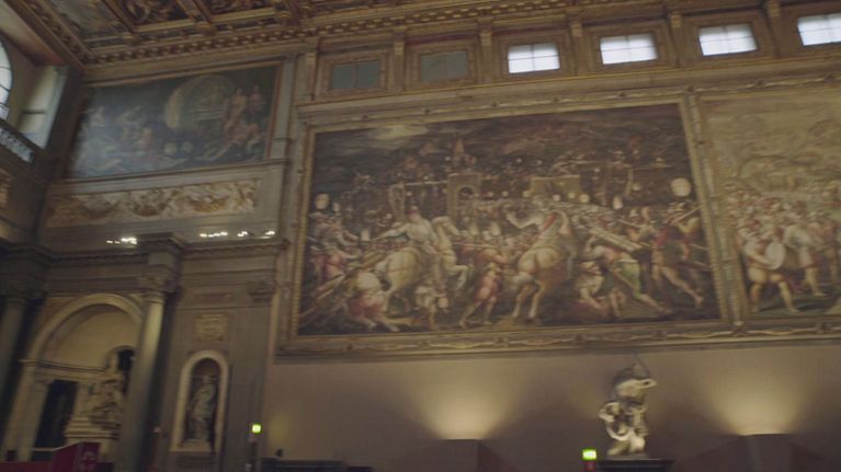 Questo salone avrebbe dovuto essere affrescato da Michelangelo e da Leonardo da Vinci: Michelangelo avrebbe raffigurato la Battaglia di Cascina e Leonardo quella di Anghiari. Le cose poi andarono molto diversamente. Gli affreschi che possiamo ammirare oggi furono realizzati dal Vasari