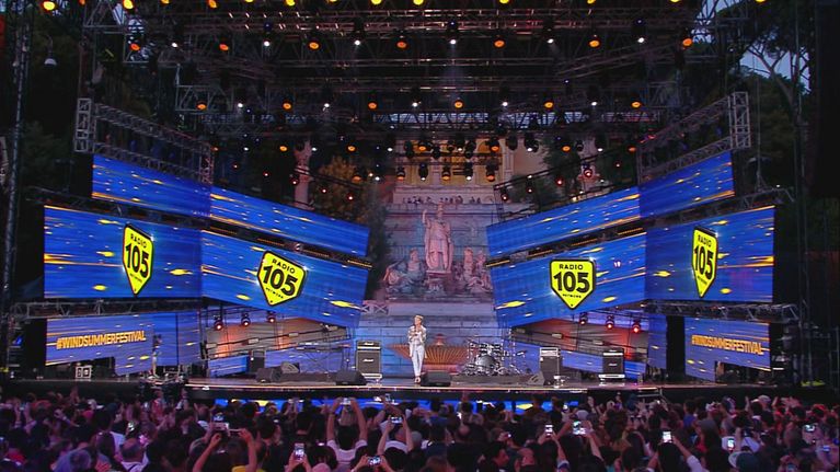 Sfoggiando un outfit casul-sexy, la conduttrice apre la serata che si può vivere anche sulla radio partner del Festival.