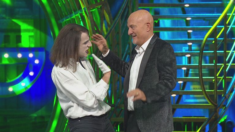 Leonardo Manera si esibisce nei panni dell'immobiliarista Pandoro in un divertente siparietto con l'aiuto di Claudio Bisio.
