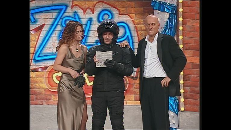 Capocenere arriva in moto a Zelig Circus 2004