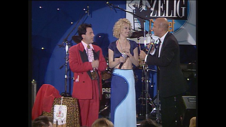 Il mago Forest mostra a Claudio Bisio e Antonella Elia un gioco con le carte a Zelig - Facciamo Cabaret 1997